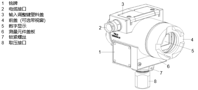 (见 5,图 4),PE 导线接线端子(2,图 4)装在表壳的正面。西门子压力变送器 打开后盖(1,图 4)可看到电气接线盒,用于电源和屏蔽接线。表壳的下部是测量元件和取压接 口(8,图 3)由一个锁紧螺丝(7,图 3)锁紧。