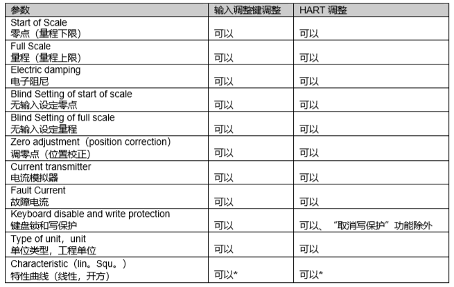 西门子压力变送器参数的调整可以在现场通过仪表自身配备的三个输入调整键实现,也可以通过 HART 协议外部实现。以下表中列出的为上述可实现的基本参数。其它用于特别用途的参数可以通过 HART 协议调整。